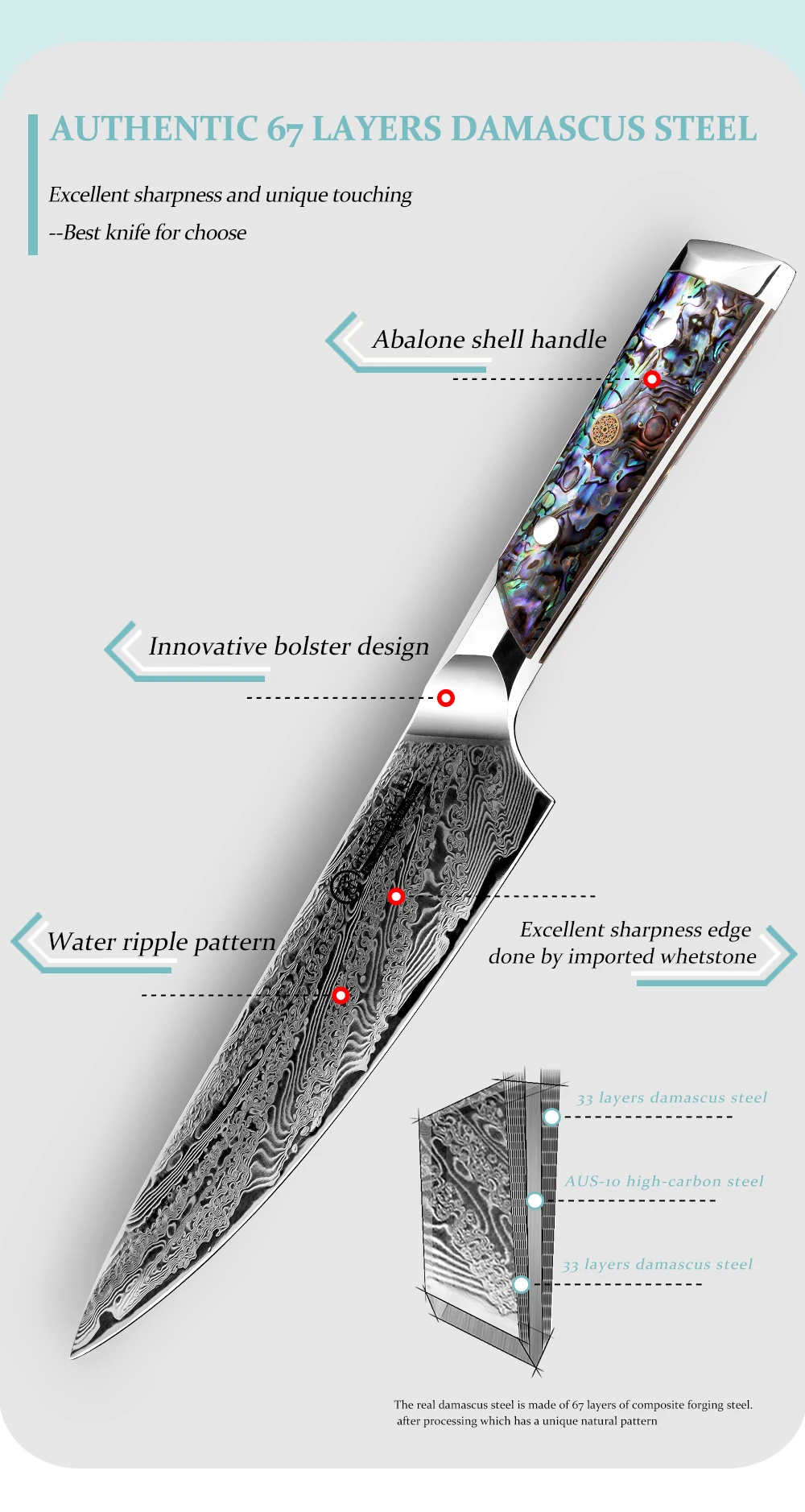 Blade material: AUS-10 Damascus Steel 67 layers