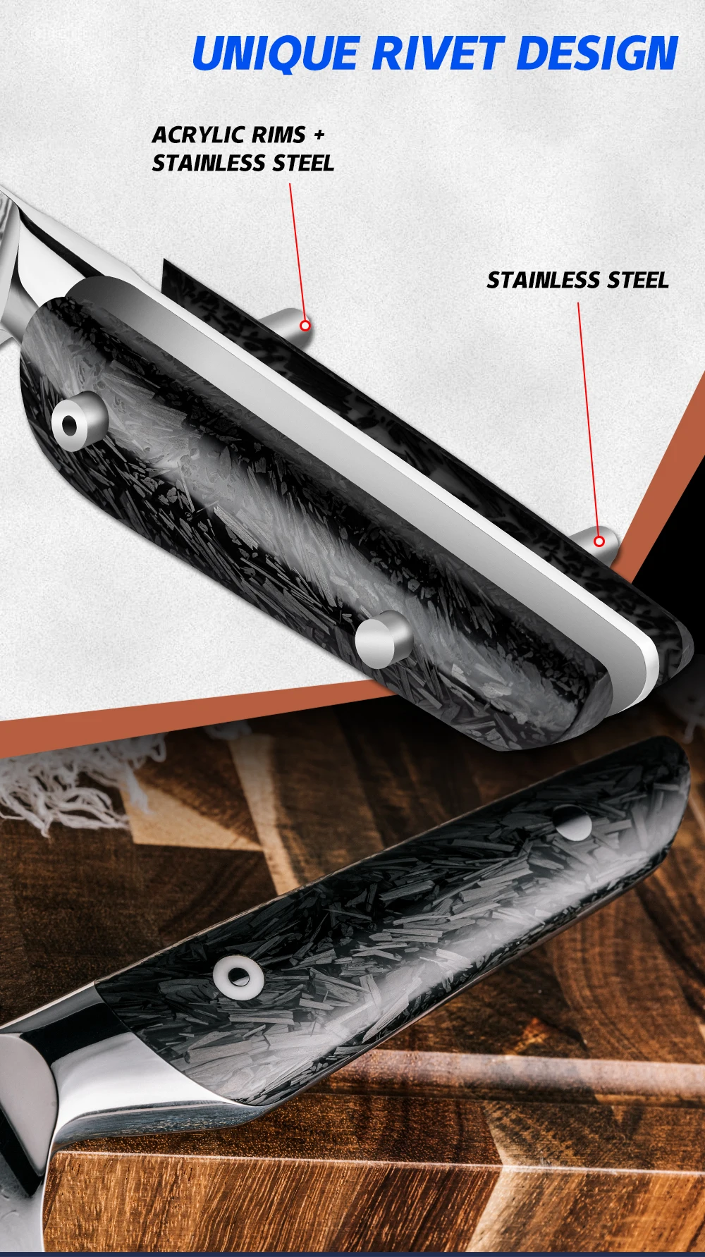 A:our factory are able to produce different kinds of knives, especially focus on high end knives such as Damascus knives and forged knife. For the knife blade, we can use damascus, three layers clad steel, etc. For the handle, we can use Pakka wood, Rose wood,Micarta, G10, etc.
