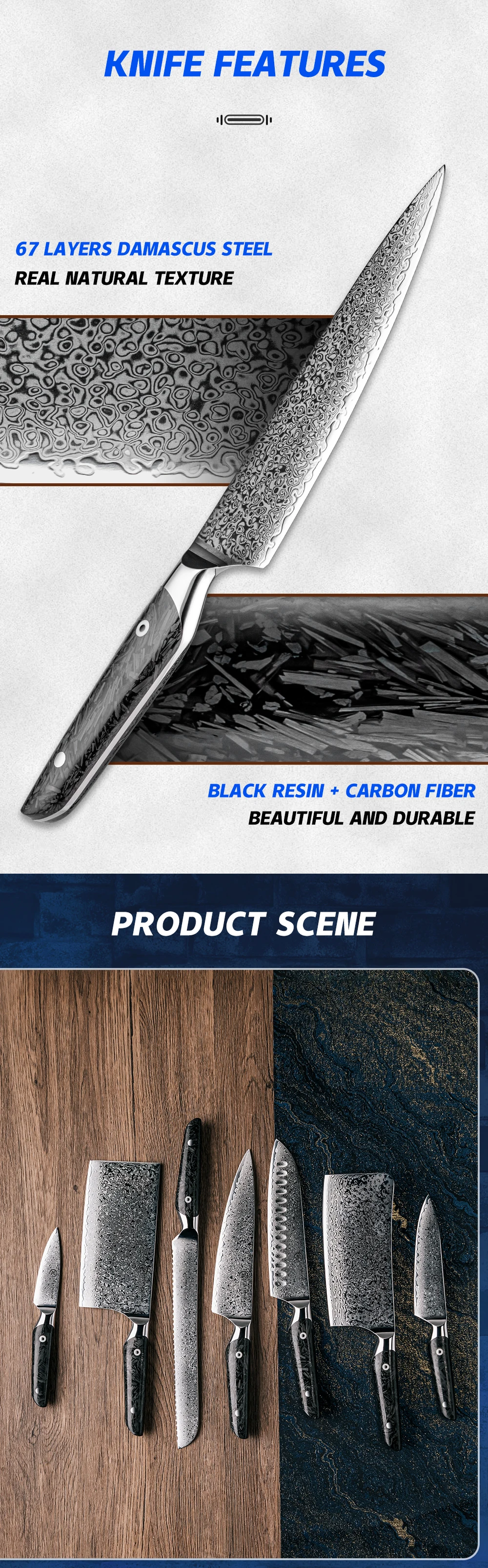Blade material: 67 Layers AUS10 Damascus Steel